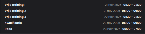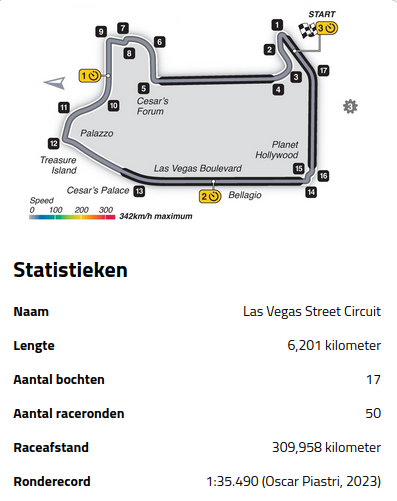 LAS VEGAS, een prima stad om te gokken dat Max hier zijn vijfde wereldkampioenschap veilig gaat stellen!! Zal een moeilijke klus worden met de concurrentie van McLaren! De 1e training: RedBull zit hier als team goed bij.Plaats 3 en 4. Ferrari met de tijden op plaats 1 en 11 een stuk wisselvalliger evenals McLaren: 6 en 8. De 2e training:Verschil in de tijden t.o.v. de 1e training is opvallend! Kwalificatie: Max weet zich als 2e achter Norris te plaatsen. Een prima positie om Norris het vuur aan de schenen te legen. De Race: Bij de start probeert Norris om Max direct af te snijden in de eerste bocht maar verremt zich daarna en Max evenals Russell halen hem in. Max heeft de leiding en kan Russell , die aandringt, net achter zich houden. Ronde 36: Max leidt nog maar Norris als 3e achter Russell rijdt supersnel en komt voorbij aan Russell, 5 sec. achter Max.Het wordt spannend. Max 1 en Norris 2 is te weinig voor Max om wereldkampioen te worden. Max kan zijn voorsprong behouden. Nog 8 ronden. Norris en Piastri worden gedisqualificeerd wegens een te korte bodemplank. Verloop van racemomenten: Kwalificatie: Einduitslag: