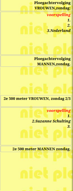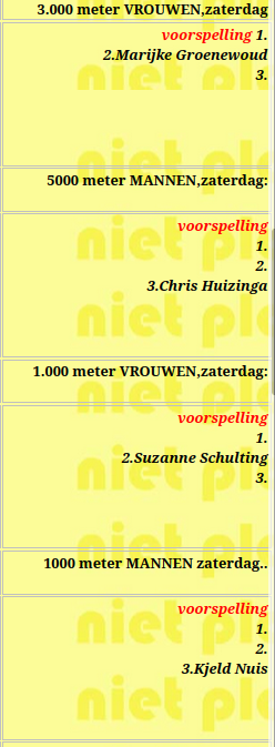 Bij Jenning de Boo idem dito ook een plekje hoger: 1 ipv 2. Bij de 1500 meter van de vrouwen zat ik er helemaal naast maar bij de mannen had ik Kjeld zijn prestatie wel weer juist ingeschat! Alleen zat er een blokje in de weg, dat is jammer.